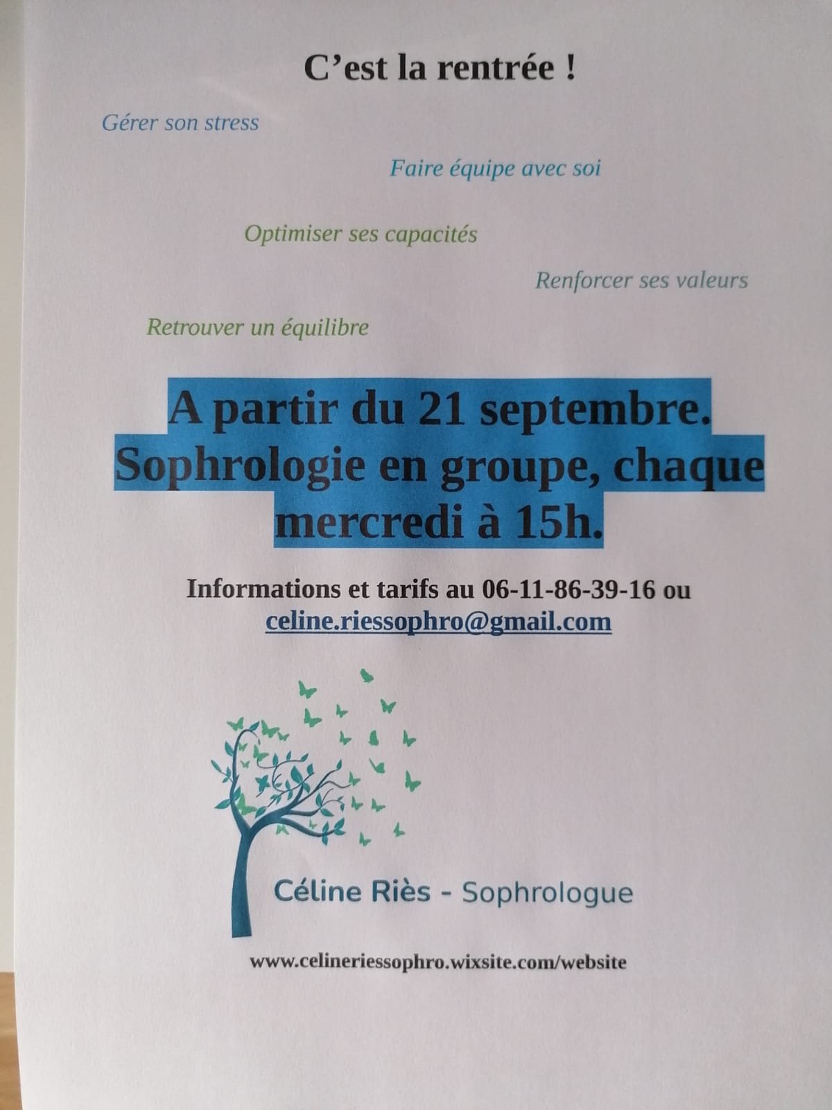 Sophrologie Saison 2022 / 2023 A partir du 21 septembre 2022, sophrologie en groupe chaque mercredi à 15H00. Informations et…